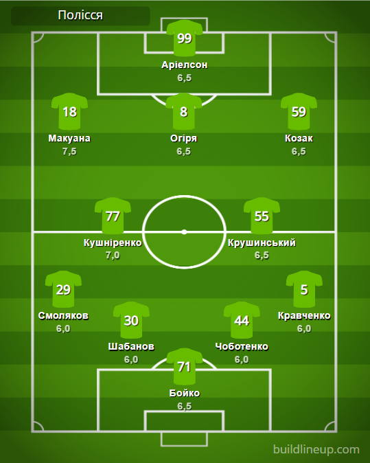 «Полісся»: Бойко – Смоляков, Шабанов, Чоботенко, Кравченко – Кушніренко, Крушинський (Грицук, 46) – Макуана (Тейлор, 73), Огіря, Козак – Аріелсон (Шастал, 66).