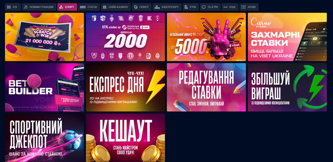 Новый клиент БК может выбрать приветственный подарок в зависимости от своих игровых предпочтений. Любители делать ставки на спорт могут активировать предложенный Vbet бонус за регистрацию и первый экспресс. После обязательной верификации нужно внести от ₴100 и оформить купон минимум из 3 событий с коэффициентами 1.2+. После расчета этого пари контора предоставит фрибет номиналом 50% от поставленной суммы — до ₴ 5000. Им можно оплатить ставку на футбол или другой спорт из раздела «Live».