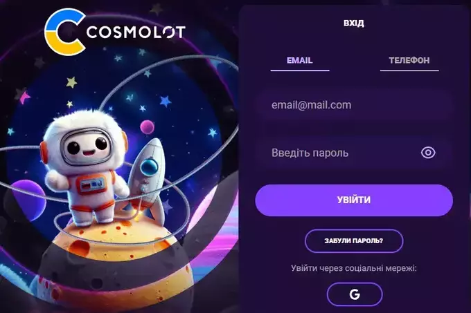 Авторизоваться на официальном сайте Cosmolot в Украине можно за несколько секунд. Для начала нужно открыть страницу «Войти». Предлагается три варианта авторизации. Если есть профиль в Google, достаточно кликнуть по соответствующему значку под надписью «Войти через социальные сети» и разрешить системе просмотр персональных данных. Осуществляя на сайте Космолот вход через логин, нужно сообщить один из контактов, указанных при регистрации (электронную почту или телефонный номер), и пароль. Последний можно восстановить, если комбинация вылетела из головы: