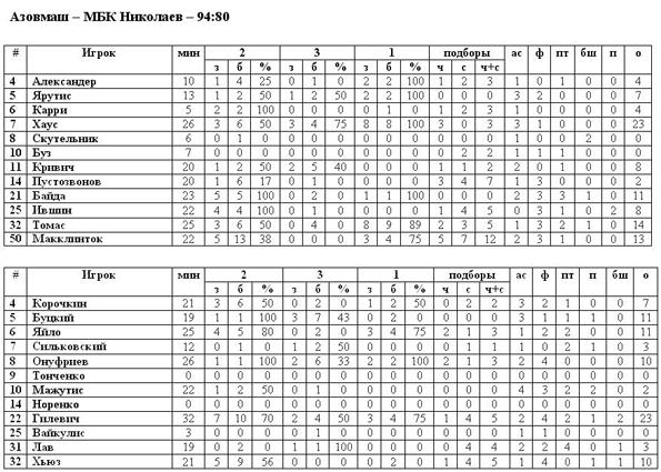 В игре подопечных Валентина Берестнева наблюдается заметный прогресс, по сравнению с предыдущими матчами. Сегодня «корабелам» удавалось неплохо разгонять свои атаки и защищаться, но для матча с «Азовмашем» этого мало. В составе гостей удачно действовал Иван Гилевич. Форвард Николаева неплохо действовал под кольцом, переигрывая Макклинтока и Томаса. После длительного перерыва это первая игра, в которой Гилевич демонстрирует былую форму. Что касается лидера в составе хозяев паркета, то сегодня им, бесспорно, был Фред Хаус. Американец набрал 23 очка, реализуя при этом большинство своих бросков со средней и дальней дистанции.