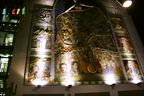 Встретит вас, ожидающих экскурсовода, вот такое вот кафе – посвященное триумфальному для Англии финалу ЧМ-1966. Над входом – кусок священной для англичан перекладины, отскочив от которой мяч пересек (или все-таки не пересек?!) линию ворот немецкого голкипера Ханса Тильковски в финальном матче турнира. Кстати, сам герр Тильковски, вернее, его копия, стоит неподалеку. Рядом телеэкран, который транслирует тот памятный финал. Таким образом, пытка вратаря продолжается вечно – что-то подобное можно встретить и в древнегреческих мифах.