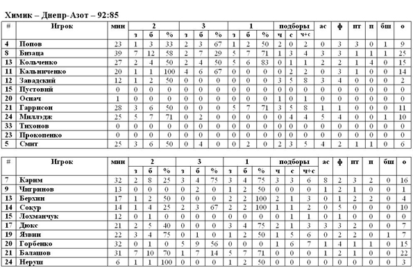Южненский «Химик» одержал вторую победу в текущем чемпионате. Сегодня соперником «бело-зелёных» был «Днепр-Азот», который в последних нескольких матчах с успехом переигрывал грандов Суперлиги. Наконец-то продемонстрировал результативную игру Бизаца, который настрелял в корзину соперников 25 баллов. Победа существенных изменений позиций для «Химика» в турнирной таблице не принесла, но, возможно, она даст толчок для дальнейших побед.