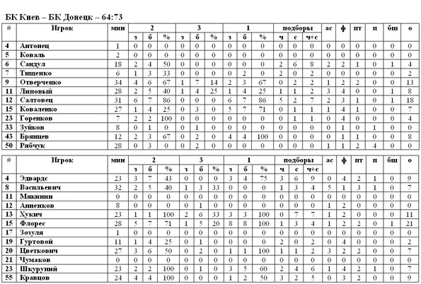 Субботний тур украинской Суперлиги порадовал баскетбольных болельщиков яркими противостояниями и неожиданными результатами. БК Киев сегодня принимал на своей площадке лидера чемпионата БК Донецк. Матч для «волков» был не из лёгких, ещё до начала поединка, было ясно, что столичному клубу вряд ли что-то светит в противостоянии с Донецком и, скорее всего, подопечных Черния ожидает очередное поражение. Так и случилось. Флорес и Хукич традиционно агрессивно действовали в атаке и набросали в корзину киевлян более 30 очков. В составе «волков» лучше всех действовал Салтовец, который набрал 18 очков и сделал 7 подборов, но для успеха его команды этого оказалось недостаточно.