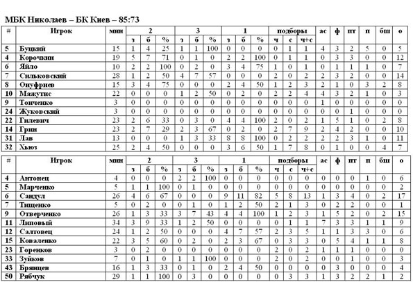 Молодые игроки столичной команды попытались сократить разрыв в счёте, и у них это неплохо получилось. В составе БК Киев лучшим смело можно назвать Максима Сандула, который сумел набрать 17 очков и собрать 13 отскоков, оформив тем самым «дабл-дабл». Финальная сирена зафиксировала на табло счёт 85:73 в пользу хозяев паркета.