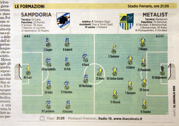 По мнению местной прессы, пару нападающих команды Ди Карло составят Поцци и Марилунго. На этот раз наставник «Сампдории», по сравнению с матчем двухнедельной давности, доверит место в стартовом составе Губерти, который в Харькове появился лишь на замену. Кроме того, должен сыграть и Паломбо, который пропускал первый матч в связи с травмой.