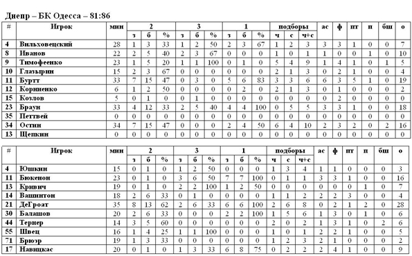 Самый интересный из субботних матчей Суперлиги состоялся сегодня в Днепропетровске. Местный клуб принимал на своей площадке БК Одесса. Как и прогнозировалось, игра получилась довольно ровной, где каждая из команд попеременно выходила вперёд. Первая половина осталась за «Днепром», который уверенно наращивал своё преимущество. По-настоящему провальной оказалась для команды Журавлёва третья четверть, в которой одесситы сумели догнать соперника в счёте, перед заключительной четвертью счёт был равным 56:56. Команда Лебединцева начала последнюю десятиминутку без раскачки. Точными попаданиями с дальней дистанции попеременно отмечались ДеГроат, Кривич и Бюкенон. Эти очки и стали ключевыми в победе гостей. В последние секунды Стивен Буртт попытался спасти ситуацию, но было уже слишком поздно.