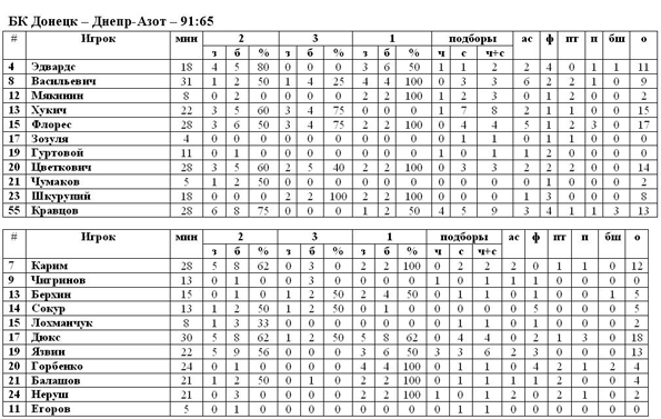Завершался игровой день противостоянием в Донецке. Местный баскетбольный клуб играл против «Днепр-Азота». Ещё до начала этого противостояния было ясно, что «тигры» вряд ли упустят победу на домашнем паркете, вопрос только был в том, с каким счётом команда Обрадовича добудет два очка. Оказывать сопротивление «азотовцы» смогли лишь в первой четверти, далее хозяева увеличили обороты и с каждой минутой отрывались от соперника всё больше. Традиционно лучшими в составе Донецка стали Хукич и Флорес.