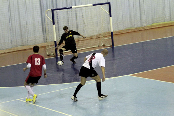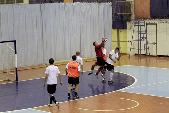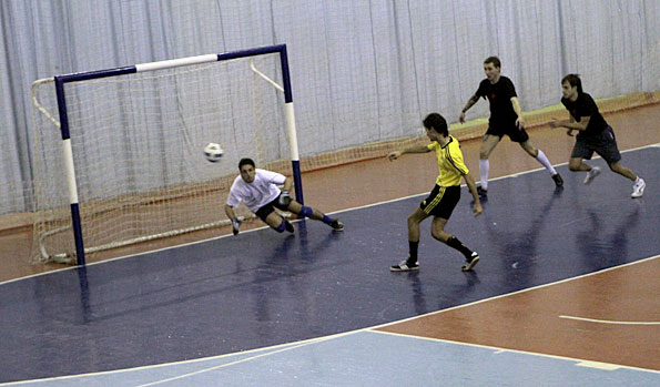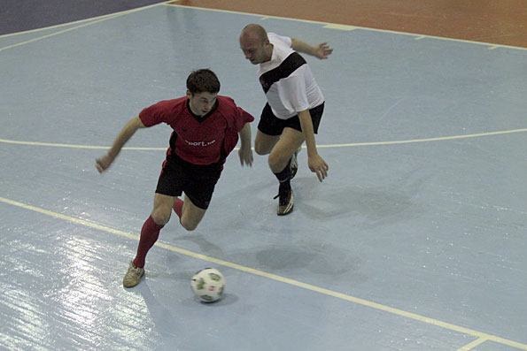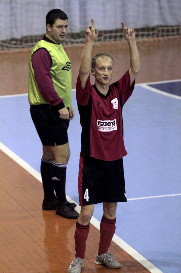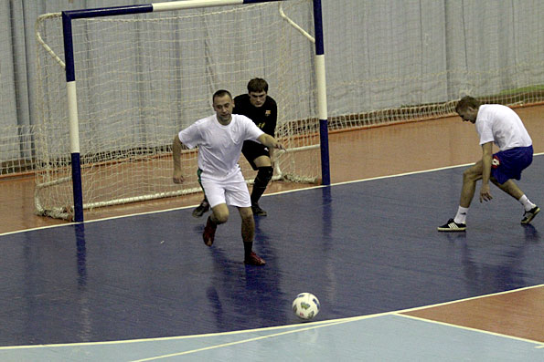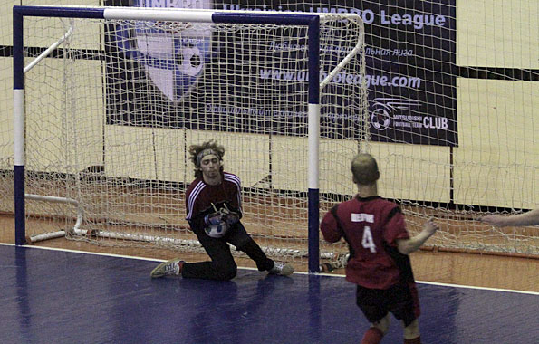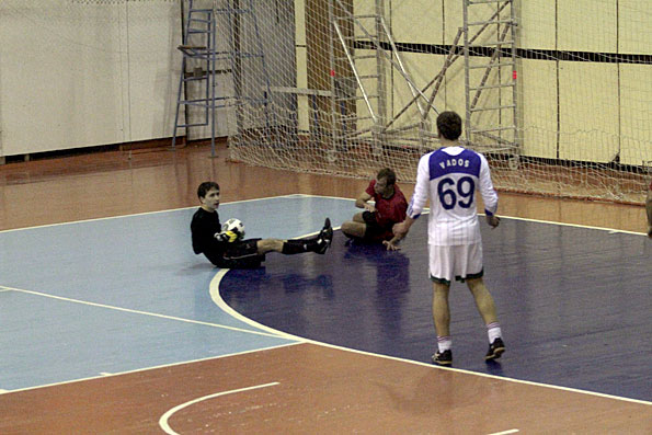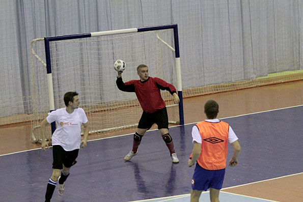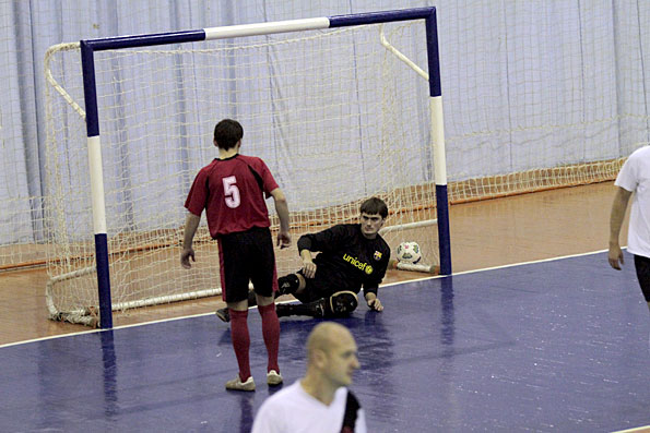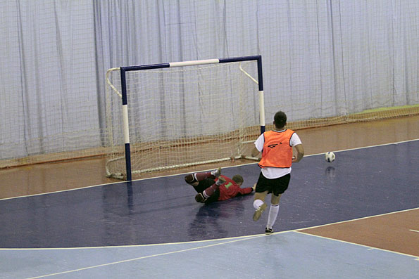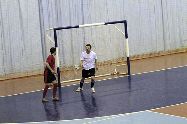 Сергей Дрыга (руководитель спортивной редакции Блика) почему-то бежит от ворот соперника :) За ним сосредоточенно наблюдает голкипер Sport.ua Михаил Шаповалов