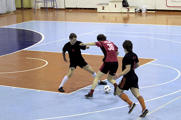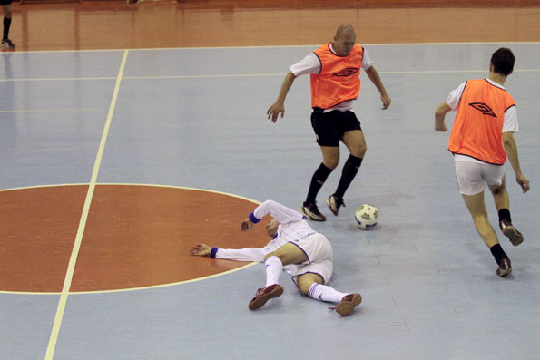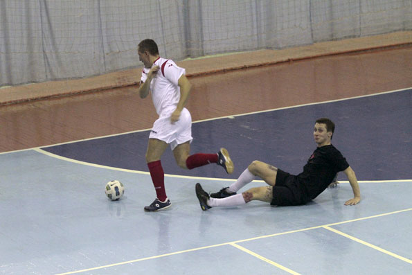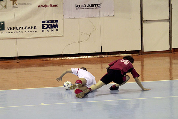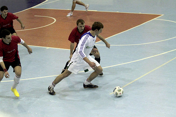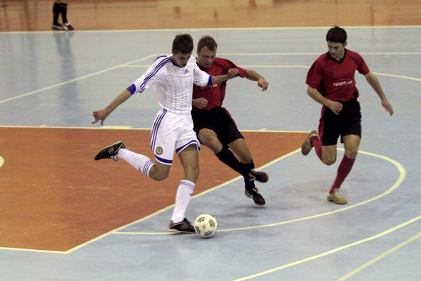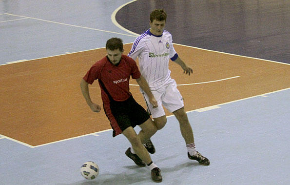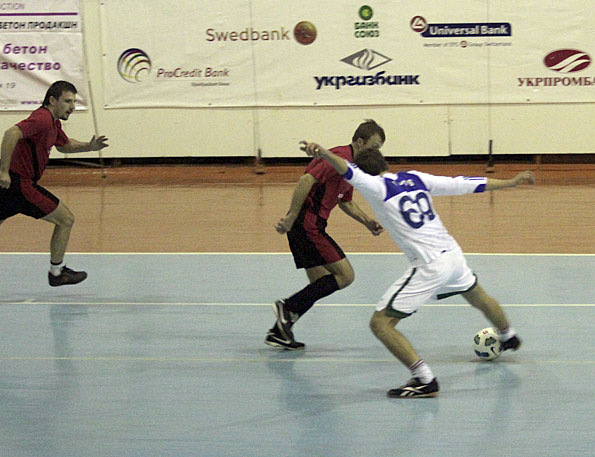 Фотограф киевского Динамо - Андрей Лукацкий - в атаке. Против него Антон Светличный и Алексей Сичкарь