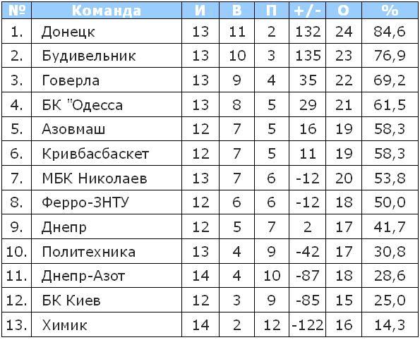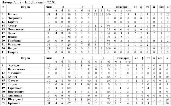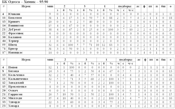 Южненский «Химик» сегодня проводил выездной матч против своих соседей БК Одесса. Это одесское дерби всегда интересно и непредсказуемо, не стало исключением и сегодняшнее противостояние. Как и в прошлом матче с Николаевом подопечные Виталия Усенко выдали блестящую первую половину, особенно «бело-зелёным» удалась первая четверть, в которой они обыграли одесситов со счётом 19:29. В остальных десятиминутках преимущество южненцев неуклонно таяло и в заключительной четверти хозяева паркета «додавили» своих оппонентов и вырвали победу со счётом 95:90. БК Донецк после досадного поражения от «Кривбасбаскета» в прошлом туре, продолжил свой вояж по Днепропетровской области и пожаловал в гости к «Днепр-Азоту».