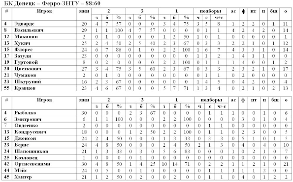 БК Донецк провёл свой первый «домашний» матч в Мариуполе. Напомним, что «тигры» временно сменили прописку из-за реконструкции основной арены в Донецке и перебрались на паркет «Азовмаша». Команда Обрадовича сегодня играла против «Ферро», запорожцы всего несколько дней назад здесь встречались с мариупольским клубом. Стартовали более активно именно подопечные Кирилла Большакова, «ферросплавы» легко действовали в атаке и весьма успешно оборонялись. Первая четверть осталась за гостями, со счётом 18:22 команды ушли на первый короткий перерыв. На вторую десятиминутку номинальные хозяева вышли более сконцентрированными. В середине четверти «тиграм» удалось впервые выйти вперёд, после этого донецкие баскетболисты своего преимущества не упускали, а только наращивали его. Каждую из последующих четвертей дончане сумели выиграть более чем убедительно, что в итоге вылилось в уверенную победу со счётом 88:60.