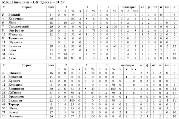 Муниципальный баскетбольный клуб из Николаева сегодня на домашнем паркете сумел одержать победу над своим географическим соседом – баскетбольным клубом из Одессы. С первых секунд хозяева понеслись вперёд, и спустя две минуты счёт был уже 8:0. «Размочить» цифры на табло сумел Тернер, после этого гостям удалось войти в игровой ритм и постепенно сокращать отрыв. За 3.50 до конца первой четверти Джон ДеГроут точным попаданием из-за дуги сравнивает счёт – 12:12. После тайм-аута, который сразу же взял Валентин Берестнев, одесситы не стали останавливаться и благодаря результативным действиям Вашингтона вышли вперёд, первая четверть закончилась со счётом 21:25 в пользу «акул». После перерыва игра заметно выровнялась, борьба за мяч велась на каждом участке паркета, в середине четверти дважды произошла смена лидера, но на большой перерыв команды ушли с тем же преимуществом команды Лебединцева в четыре очка.