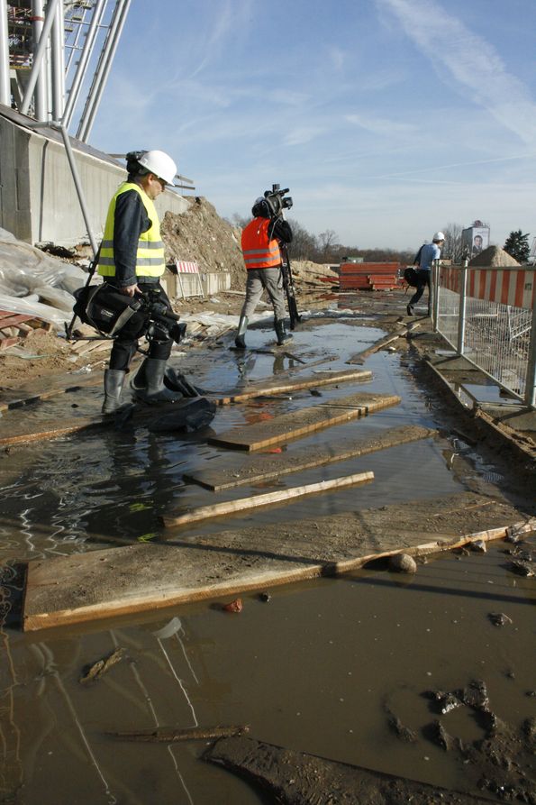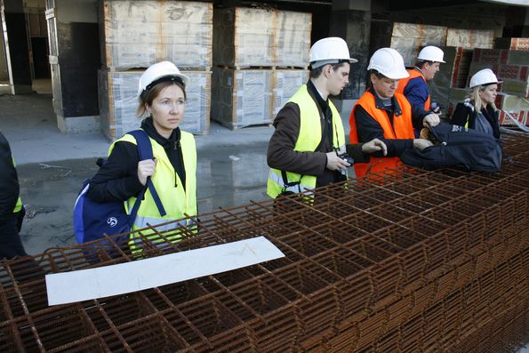 Перед походом на сам стадион пришлось переобуться в резиновые сапоги и облачиться в яркие жилеты и строительные каски – стройка есть стройка.