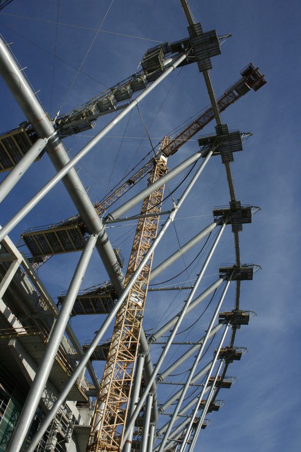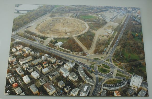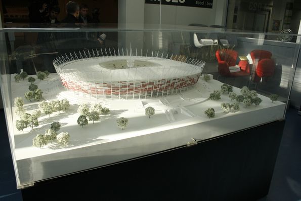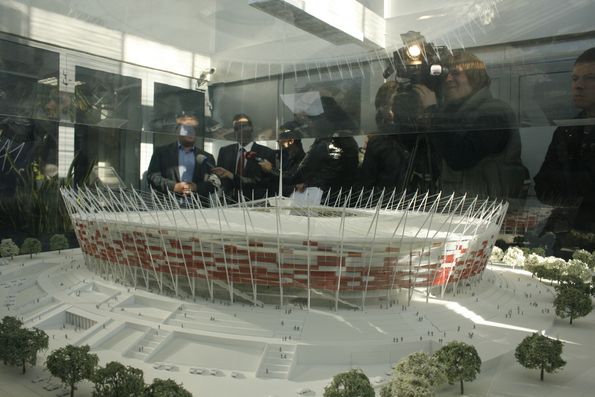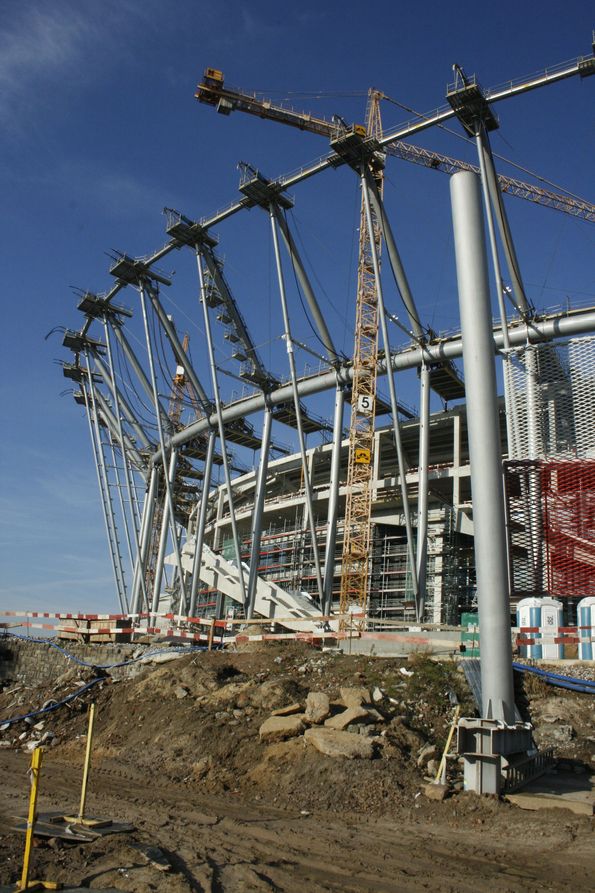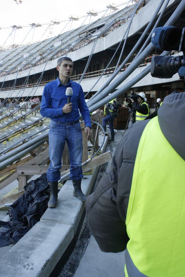 В составе журналистской делегации от Украины удалось побывать на строительстве «Национального» стадиона в Варшаве. Первый раз я увидел этот стадион год назад. Можно было созерцать преимущественно земляные и бетонные работы на начальных уровнях. Второй раз приехал сюда летом этого года -- стадион уже обрел свои контуры, в которых угадывалось будущее строение главной польской арены Евро-2012. Сейчас здесь полным ходом идет подготовка к поднятию над объектом тросов, которые будут удерживать мембрану-крышу стадиона.