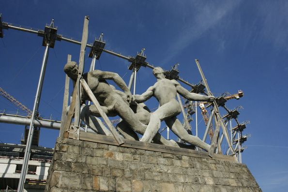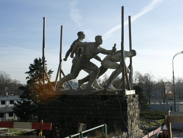 Это все, что осталось от старого стадиона - скульптурная группа «Эстафета». И в этом есть некий символизм: в следующем году будет построен «Национальный», который примет эстафетную палочку от своего предшественника -- стадиона Десятилетия.