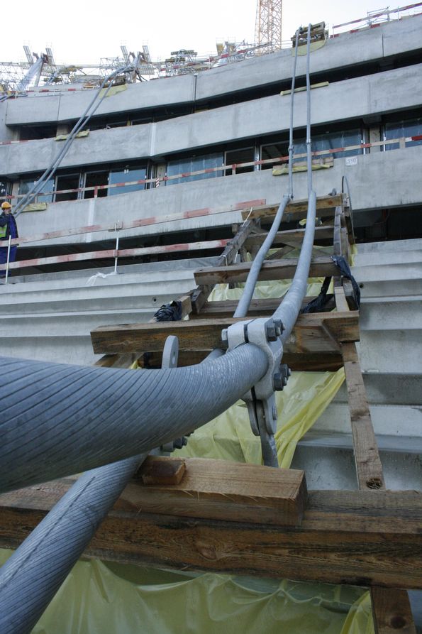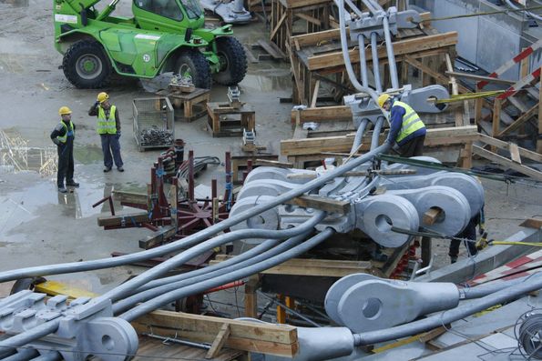 ... и мы на трибуне. А вот и эти самые металлические мощные – диаметром сантиметров в 30 -- тросы, которые пока беспомощно свисают вдоль периметра арены.