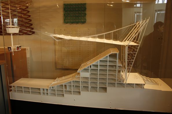 На этом макете -- трибуна в разрезе -- слева виден шпиль с экранами, который удерживается натянутыми тросами