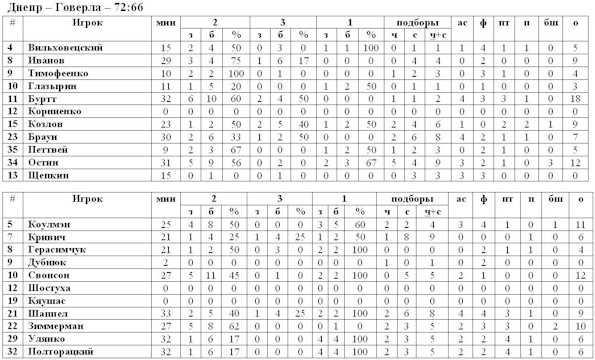 Днепропетровский «Днепр» на домашнем паркете сумел переиграть довольно серьёзного соперника ивано-франковскую «Говерлу». «Бело-синие» вышли вперёд с первых минут матча, чувствовалось, что игроки достаточно мотивированы и отлично настроены на борьбу. Сравнять счёт гостям удалось под занавес первой четверти, а ушли команды на первый короткий перерыв при минимальном преимуществе хозяев поля в одно очко. Со старта второй десятиминутки днепропетровцы ушли в отрыв, поддерживать высокий темп игры подопечным Дениса Журавлёва удавалось на протяжении всего матча. Это позволило «Днепру» не подпускать соперника к себе в счёте и довести матч до итоговой победы. Традиционно самым результативным в составе днепропетровцев стал Стивен Буртт, на счету которого 18 пунктов.