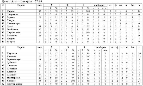Во втором матче игрового дня ивано-франковская «Говерла» проводила выездной матч против «Днепр-Азота». Ещё до начала поединка большинство любителей баскетбола предрекали уверенную победу гостей, единственное, на что могли надеяться хозяева, так это на возвращение того уровня игры, который «Азот» демонстрировал в середине первого круга. К сожалению, для днепродзержинцев этого не случилось и баскетболисты «Говерлы» устроили настоящий погром уже в первой четверти. Результативные действия «медведей» в атаке привели к тому, что уже после первой десятиминутки команда вела со счётом 9:23. На вторую четверть хозяева вышли более собрано и сумели дать бой ивано-франковцам. Всё, на что хватило «азотовцев», так это играть на равных с гостями. Игра протекала в подобном ключе до самой финальной сирены, за три четверти подопечные Чигринова лишь немного сократили отставание и уступили со счётом 77:88.