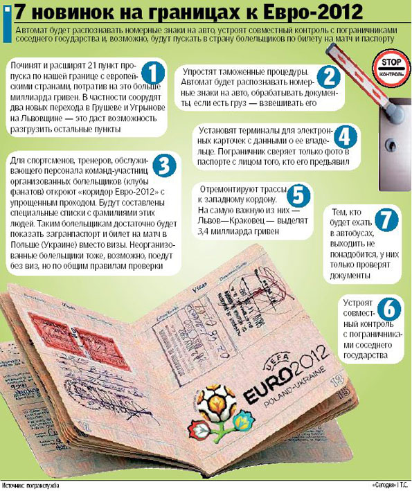 К Евро-2012 время ожидания на границе обещают свести до минимума. Для этого должны починить старые переходы и открыть новые, а также ввести совместный контроль пограничников двух стран, делящих кордон. А на время самого турнира туриста обещают пропускать за пять минут. Вместо визы в Европу, возможно, будет достаточно показать только билеты на матчи (сейчас власти об этом договариваются с поляками).
