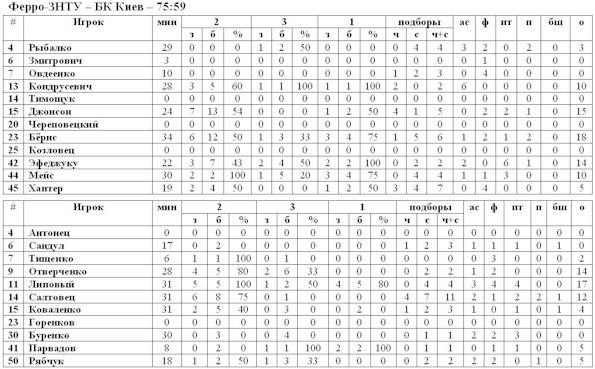 Запорожский «Ферро» сумел прервать череду проигрышей и переиграл на домашнем паркете БК Киев. Конечно, «ферросплавы» значительно превосходят киевлян по подбору игроков, но в прошлом туре «волки» обыграли неплохо укомплектованную Одессу, так что шансы были. Всё же Кирилл Большаков сумел правильно подготовить свою команду к этому матчу и хозяева паркета с первых секунд захватили преимущество в свои руки. Запорожцы лидировали на протяжении всего матча и легко довели встречу до победы с преимуществом в 16 очков.