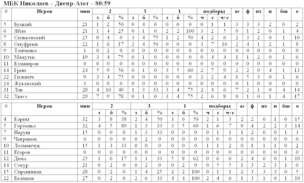 Завершала игровой день пара МБК Николаев - «Днепр-Азот». В роли хозяев в этом матче выступали именно муниципалы. «Корабелы» пытались реабилитироваться перед собственными болельщиками за два последних поражения на домашнем паркете и уверенно расправились с днепродзержинцами. Уже в первой четверти «бело-синие» уверенно ушли вперед, что касается «Азота», то единственным игроком, который набирал очки с игры в первой десятиминутке, был Карим. Во втором игровом отрезке хозяева увеличили своё преимущество, при этом, не включая полных оборотов. Вторую половину, по сути, упорной борьбой и зарождением интриги охарактеризовать уж никак нельзя. Игроки «Днепр-Азота» пытались сократить отставание «выстрелами» из-за дуги, а николаевские баскетболисты не раз пытались повеселить местную публику яркими алей-упами и эффектно разыгранными комбинациями. После блестящих данков в исполнении Грина и Хьюза трибуны СК «Надежда» взорвались и начали поддерживать любимую команду ещё активнее. Подопечные Валентина Берестнева уверенно удержали добытое преимущество и завершали поединок наполовину резервным составом.