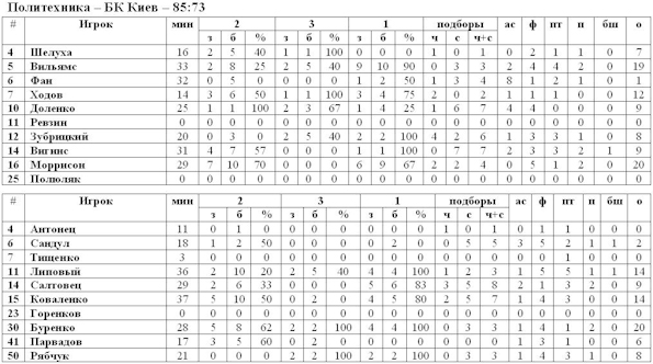 Столичный БК Киев потерпел очередной поражение. На этот раз в роли обидчика команды Виталия Черния выступила «Политехника-Галичина». После смены наставника рисунок игры львовской команды существенно изменился и это понемногу даёт плоды. Да, возможно, результат пока проявляется не во всех матчах, но уровень вырос значительно. Команда не раз доказывала, что может навязывать свою игру более сильным соперникам и заставлять фаворита «потеть». В матче с «волками» команде Подковырова пришлось нелегко. Первая половина была равной, основные события припали на третью и четвёртую десятиминутки. Именно в этот момент хозяева паркета сумели увеличить обороты в атаке и более дисциплинированно сыграть в защите. Львовяне вышли вперёд и уверенно довели матч до победы. Самыми результативными в составе победителей стали американцы Вильямс и Моррисон, на счету которых 39 очков.