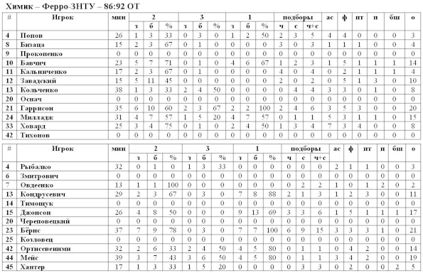 Единственным моментом в матче, когда хозяева могли переломить ход поединка, стал отрезок игрового времени в заключительной десятиминутке, несколько атак подряд результативно закончил Кальниченко и «Химик» оторвался на 9 очков. Точные попадания всё того же Бёрнса, а также Джонсона сократили отставание. В оставшееся время победу могла одержать каждая из команд, мог принести победу своей команде Мейс, который не попал дальний бросок на последних секундах. Сирена об окончании четвёртой четверти зафиксировала на табло СК «Олимп» счёт 78:78, это означало, что командам предстоит выявить сильнейшего в дополнительное время. В овер-тайме всё же гости сумели взять своё. В команде Большакова блистали всё те же, за пятиминутку «Ферро» удалось продемонстрировать неплохую результативность и набрать 14 пунктов, в то время как их соперники отметились лишь 8-ю. Итог матча – победа запорожской команды со счётом 86:92.