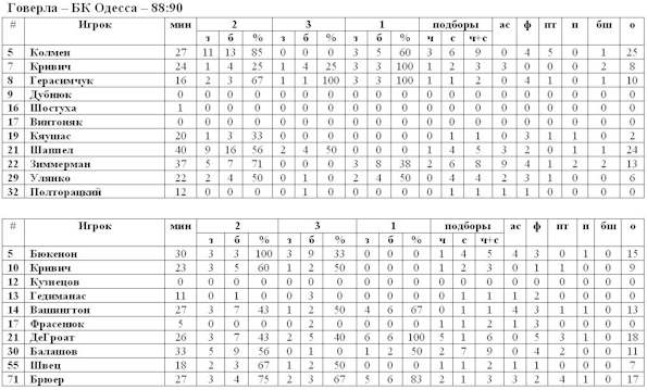 Настоящая драма разворачивалась сегодня в Ивано-Франковске, где «Говерла» принимала Одессу. Предсказуемо «медведи» сходу захватили инициативу в свои руки, результативные действия в атаке Зиммермана, Колмена и Шаппела позволили подопечным Мурзина совершить стартовый рывок 13:3. Гости сумели отойти от такого шока ближе к середине первой четверти. Активная игра одесских американцев позволила «акулам» не только сравнять счёт, но и минимально выйти вперёд перед первым коротким перерывом в матче. Вторая четверть началась в том же духе, по крайней мере, со стороны хозяев. «Медведи» уверенно наращивали обороты и практически весь матч удерживали гостей на десятиочковом расстоянии. Настоящим кошмаром для «Говерлы» обернулись последние три минуты матча, перед завершением которых хозяева имели преимущество в 11 очков. Настоящий ливень трёхочковых от Брюэра, Кривича и ДеГроута обрушился на корзину ивано-франковцев. Героем матча в составе одесситов стал Вашинтон. За три секунды до конца американец забил два очка, которые и принесли итоговую победу «акулам» на чужом паркете.