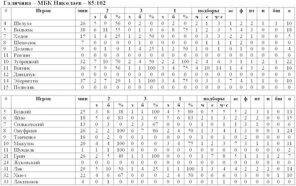 Несмотря на кадровые проблемы, МБК Николаев сегодня сумел уверенно обыграть во Львове «Политехнику». Команда Подковырова также находится сейчас не в оптимальном составе, поэтому в этом компоненте шансы команд уравнивались. Активнее начали гости, после короткой разведки николаевцы принялись «бомбить» корзину соперников из-за дуги. Поочерёдно попадания Онуфриева, Буцкого, Сильковского и Грина увеличивали разрыв в счёте. Забегая наперёд, отметим, что сегодня «корабелы» выдали блестящий процент дальних бросков, реализовав 11 из 19 (58%). При этом капитан МБК Николаев Алексей Онуфриев забросил 6 «трёшек» из 7. На большой перерыв команды ушли при счёте 47:54 в пользу команды Берестнева. Основные события припали на третью десятиминутку. Шквал атак от Онуфриева, Яйло и Лава приближали «бело-синих» к успеху. В составе «Галичан» блистал Зубрицкий, который результативно действовал как из-под щита, так и с периметра, но «один в поле не воин», поэтому николаевцы спокойно наращивали своё преимущество и свели матч к уверенной победе. Итог – 85:102 в пользу МБК Николаев.