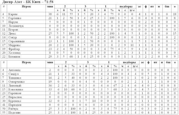 БК Киев сегодня продлил серию проигранных матчей до четырёх подряд. В рамках очередного тура Суперлиги «волки» отправились в гости к «Днепр-Азоту», команде, которая является соседом киевлян в турнирной таблице, поэтому лишний раз говорить о принципиальности этого противостояния не стоит. Похоже, что проблем с плохим психологическим состоянием, которое команда могла обрести после разгромного поражения в прошлом туре от Донецка, подопечные Черния не испытывали. Первая половина матча осталась за гостями. Результативная игра Коваленко, Рябчука, Подоляна и Липового позволяла БК Киев иногда отрываться от оппонентов на расстояние 10+, что, безусловно, для выездного матча значит не мало. В составе днепродзержинцев в первой половине следует отметить лишь Дюкса, но его игры было недостаточно. Перелом встречи наступил в третьей четверти, точные попадания Каррима, а также агрессивная игра под щитами Фрейзера и Меррикса позволили «Днепр-Азоту» сначала сравнять счёт, а затем и вовсе выйти вперёд. После того, как хозяева заполучили статус лидера матча, им удалось сохранить его до самой финальной сирены. Разрыв в счёте составил 13 пунктов в пользу команды Игоря Чигринова.