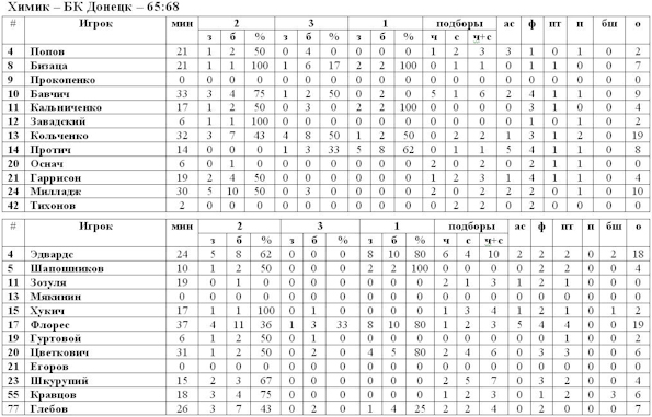 В Южном едва не грянула сенсация, где один из аутсайдеров чемпионата «Химик» принимал БК Донецк. У гостей игра не заладилась с самого начала, а вот хозяева просто удивляли своей напористостью и с каждой минутой наращивали преимущество. Просто неудержим был Александр Кольченко, его попадания из-за дуги неоднократно прибавляли «бело-зелёным» уверенности. В роли спасителей «тигров» выступили Флорес и Эдвардс, эта пара легионеров за последние десять минут сумела сравнять счёт, а под занавес поединка и вовсе вывести свою команду вперёд. Донецк добыл нелёгкую победу с преимуществом всего в три очка.