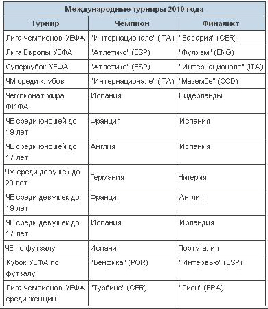 В майском финале Лиги чемпионов УЕФА победу одержал «Интернационале», ставший сильнейшим клубом Европы впервые с 1965 года. В решающем матче дружина Жозе Моуринью со счетом 2:0 одолела «Баварию». Дебютный розыгрыш Лиги Европы УЕФА увенчался триумфом «Атлетико», который завоевал первый еврокубок с 1962 года. Кроме того, «Интер» и «Бавария» выиграли по два трофея на внутренней арене. Сборная Испании в свою очередь прибавила к золоту ЕВРО-2008 победу на ЧМ-2010 в ЮАР. Последний раз чемпионом мира и Европы в 2000 году становилась Франция.