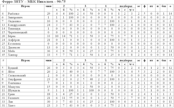 К противостоянию с николаевцами восстановился лидер «ферросплавов» Кристиан Бёрнс, забегая наперёд, отметим, что американцу сполна удалось отметить своё возвращение в строй, на его счету 26 очков и 8 подборов. Хозяева паркета сразу же захватили инициативу в свои руки, в первые минуты неплохо действовал Хантер, несколько точных попаданий Винсента уже к концу первой четверти сделало преимущество «Ферро» равным семи очкам, но за мгновения до сирены Буцкий сумасшедшим броском со своей половины, сделал счёт 24:20, с которым команды и ушли на первый короткий перерыв. Во второй четверти подопечные Берестнева значительно прибавили, это сразу сказалось на течении игры. Активный прессинг несколько раз дал возможность гостям перехватить мяч и реализовать скоростной прорыв. Погоню за командой Большакова возглавил всё тот же Буцкий, которого вполне успешно поддержали Гилевич, Грин и Яйло. На большой перерыв команды ушли с минимальным разрывом – 50:49 в пользу «Ферро».