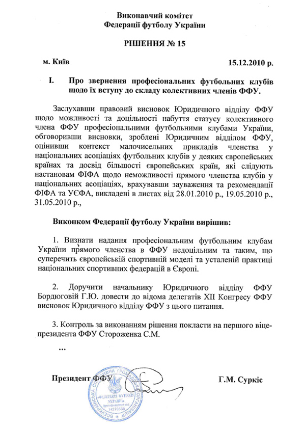 15 грудня 2010 року в Будинку футболу відбувся Виконком ФФУ. Інформацію про засідання не оприлюднило жодне ЗМІ. До речі, згідно з рішенням цього ж Виконкому журналісти відтепер не будуть присутніми на засіданнях Комітету. Про його результати ПФЛ дізналася тільки через місяць, тобто 12 січня цього року отримано офіційне рішення. На засіданні розглянуто питання про звернення професіональних футбольних клубів щодо їх вступу до складу колективних членів ФФУ. Виконком визнав недоцільним надання клубам законного права набути колективного членства в ФФУ.