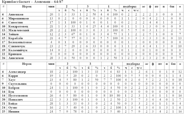 Ответный матч между «Кривбассбаскетом» и «Азовмашем» не подарил такой интриги, которая присутствовала в субботнем противостоянии в Мариуполе. Упорной была лишь первая четверть, в этой десятиминутке лидер менялся несколько раз. На точные броски в исполнении Кораблёва и Зайцева результативно отвечали Александер и Оуэнс. Начиная со второй четверти, Хаус и Ившин залпом из точных бросков увеличили обороты команды Ярутиса, поэтому с каждой следующей атакой разница в счёте только увеличивалась. «Машиностроители» выглядели очень уверенно, по сравнению с домашним матчем, неплохо влился в игру в противостоянии с «Кривбассбаскетом» восстановившийся после травмы Максим Пустозвонов, на счету которого в текущей встрече 16 очков. Когда перед заключительной четвертью разница в счёте была +20 для «Азовмаша», стало понятно, что «машиностроители» могут позволить себе расслабиться, т.к. отыграть отставание практически в 30 очков (по суммам двух встреч) за десять минут просто невозможно. Финальная сирена зафиксировала уверенную победу «Азовмаша» со счётом 64:87 и выход «львов» в финал четырёх, где они, безусловно, выглядят одними из фаворитов.