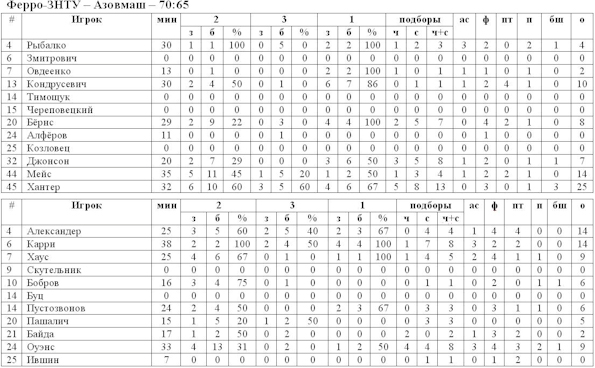 Очень интересным сегодня было противостояние в Запорожье между «Ферро-ЗНТУ» и «Азовмашем». Уже в первой четверти команды перехватывали лидерство друг у друга несколько раз. В составе хозяев традиционно результативно действовали Хантер и Мейс, а вот самый полезный запорожский игрок Кристина Бёрнс в последнее время не радует болельщиков былой результативностью. Возможно, сказывается то, что форвард ещё не до конца восстановился после полученной травмы и не вошёл полностью в игровой ритм команды. Под занавес первой четверти Рамелл Карри в двух атаках подряд сумел вывести «Азовмаш» вперёд и на первый перерыв гости ушли лидерами. Вторая четверть также характеризовалось плотной борьбой и множеством ошибок, в которой немного сильнее были мариупольцы. Самое интересное запорожских болельщиков ожидало во второй половине встречи. Именно в последних двух четвертях подопечные Кирилла Большакова сумели перехватить инициативу и сначала настигнуть оппонента, а в заключительной десятиминутке и вовсе склонить чащу весов в свою сторону. Творцами этого успеха стали всё те же Мейс и Хантер, вклад которых в общий счёт является наибольшим.