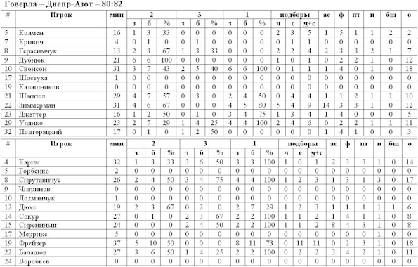 Матчи Суперлиги, состоявшиеся в понедельник, подарили любителям баскетбола несколько интересных результатов. «Днепр-Азот» продолжает уверенно подниматься со дна турнирной таблицы, на этот раз подопечные Игоря Чигринова в упорной борьбе на выезде переиграли «Говерлу». Как и ожидалось, активнее начали хозяева паркета. Свонсон, Шаппел и Зиммерман уже за первые десять минут успели создать восьмиочковое преимущество для своей команды. Во второй десятиминутке гости заметно прибавили, активнее всех удавалось играть Фрейзеру и Сирутавичус. В середине периода днепродзержинцы вышли вперёд на несколько пунктов, с этого момента команды сменяли друг друга в роли лидера несколько раз. До самой финальной сирены не было ясно, кто одержит два очка в этом противостоянии, точно исполненные два штрафных от Сирутавичуса за 4 секунды до конца подарили победу «Днепр-Азоту».