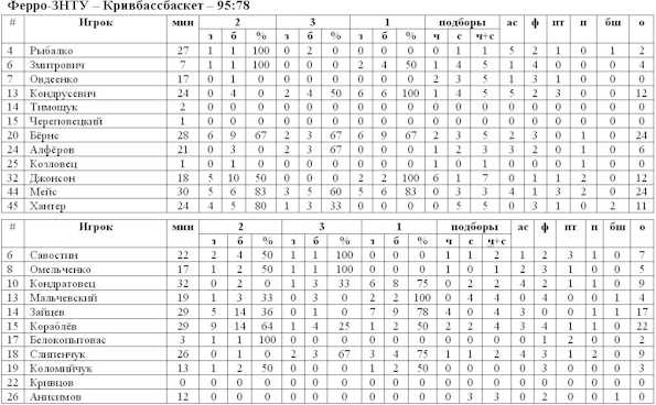 Похоже, что «Кривбассбаскет» в ближайшее время ожидает падение в турнирной таблице. После того, как из-за финансовых проблем клуб отказался от услуг всех легионеров, уровень игры команды заметно упал. Сегодня криворожцы проиграли на выезде «Ферро-ЗНТУ». Равная борьба на площадке велась лишь первые пятнадцать минут, в составе гостей роли лидеров на себя взяли Зайцев и Кораблев, но их усилий хватило не на долго. Пара запорожских легионеров – Мейс и Бёрнс на двоих набрали более чем половину всех очков команды Большакова. Уже в дебюте заключительной десятиминутки стало ясно, что победителем этой дуэли будет «Ферро», т.к. разница в счёт была равна практически двадцати очкам. «Ферросплавы» спокойно довели матч до победы, добыв 14-ю победу в чемпионате.