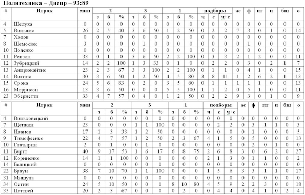 Закрывала игровой день пара «Политехника» - «Днепр», матч во Львове выдался очень упорным. На протяжении всех сорока минут разница в счёте не превышала шести очков, независимо от того, кто находился в роли лидера. В составе «Днепра» уже традиционно самым результативным стал Буртт, на счету первого номера «бело-синих» 27 набранных очков, при этом Стивен собрал 8 отскоков, согласитесь, очень нестандартный показатель для разыгрывающего. Несмотря на такую результативность, днепропетровцы не смогли уйти от поражения. Андрюкайтису, Вильямсу и Вигинсу в ключевые моменты удавалось возвращать преимущество своей команде. Именно Андрюкайтис, набрав в концовке пять очков, стал настоящим героем матча и подарил «Политехнике» такую нужную победу. Итог противостояния – 93:89 в пользу львовской команды.