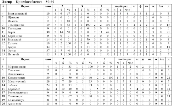 Криворожский «Кривбассбаскет» продолжает терпеть неудачи в чемпионате. Сегодня подопечные Чурсина проиграли на выезде «Днепру». До начала этой встречи команды находились по соседству в турнирной таблице, при чём криворожцы занимали пятую строчку, а их соперники – шестую. В случае успеха, команда Журавлёва имела возможность обойти «Кривбассбаскет», поэтому на это противостояние днепропетровцы настраивались по-особенному. Как и предполагалось, более успешно в игру сумели влиться хозяева паркета. Повёл за собой партнёров по команде лидер «Днепра» Стивен Буртт, разыгрывающий «бело-синих» не только умело поражал корзину соперника, но и успевал ассистировать партнёрам. Ближе к середине второй десятиминутки усилиями Кондратовца и Кораблёва гости сумели настигнуть соперника и немного выйти вперёд. Равная борьба, с попеременным лидерством обеих команд велась вплоть до середины третьей четверти. Несколько подряд попаданий от Буртта, Брауна и Вильховецкого позволили хозяевам паркета увеличить разницу в счёте до 10 очков в свою пользу. Создавалось впечатление, что «Кривбассбаскет» просто подсел физически, ключевые игроки криворожцев просто не способны проводить все сорок минут игрового времени в высоком темпе, а равноценной замены лидерам в команде просто нет. В оставшееся время гости так и не смогли приблизиться к «Днепру», победа за хозяевами паркет со счётом 80:69.