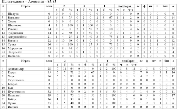 Львовская «Политехника» сумела сотворить сегодня настоящую сенсацию, обыграв на домашнем паркете «Азовмаш». Мариупольский клуб выглядит уж очень нестабильно, о чём свидетельствуют результаты матче после Нового года. Этим-то и сумели сполна воспользоваться львовяне. Стартовали более успешно гости, точные попадания от Хауса и Карри уже в первые минуты сделали счёт 0:4. К середине первой четверти Ревзин и Срока сумели сравнять счёт двумя «дальними». Весь матч на паркете велась очень упорная борьба, лидер неоднократно менялся. На точные попадания Александера и Пашалича, хозяева отвечали результативными действиями Вильямса и Вигинса. Решающей стала заключительная десятиминутка, а вернее её последняя минута. После того, как Мартинас Андрюкайтис реализовал два штрафных, счёт стал 83:83. Фред Хаус не забросил трёхочковый и хозяева получили шанс добыть победу в матче с чемпионом. После неудачного броска Андрюкайтиса, Срока выиграл подбор и добавил мяч в корзину. Встреча закончилась со счётом 85:83 в пользу «Политехники».