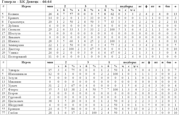Поражение «Азовмаша» позволило «Говерле» выйти на третью строчку в турнирной таблице, «медведи» сегодня дома обыграли БК Донецк. Начало встречи выдалось очень нервным, после заработанных гостями трёх очков, обе команды на протяжении четырёх минут не могли реализовать ни одной своей атаки. Ближе к середине первой четверти игра успокоилась и соперники заиграли в быстрый баскетбол. Более удачно удавалось действовать команде Саши Обрадовича, Флорес двумя подряд трёхочковыми ещё до первого короткого перерыва сделал счёт 11:17 в пользу гостей. Отметим, что донецким баскетболистам удавалось удерживать преимущество на протяжении практически всего игрового времени. Как и в другом воскресном матче, все определилось в последние секунды. Решающий трёхочковый в исполнении Герасимчука вывел ивано-франковцев вперёд, броски в исполнении Цветковича и Глебова не достигли цели и «Говерла» удержала минимальное преимущество. Матч закончился со счётом 66:64 в пользу подопечных Мурзина.