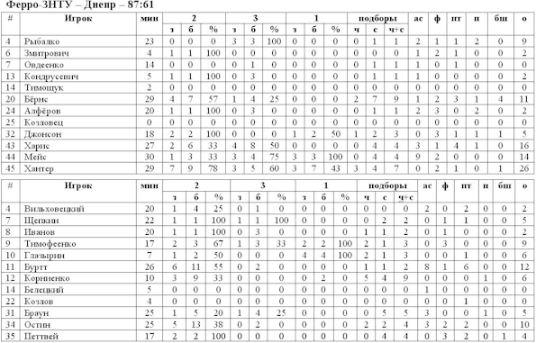 Довольно удачным выдался дебют для Рики Хариса в составе его новой команды – запорожского «Ферро-ЗНТУ». Сегодня подопечные Кирилла Большакова на домашнем паркете более чем уверенно обыграли «Днепр». Команды начали матч без раскачки и сходу принялись реализовывать каждую из своих атак. Открыл счёт Марио Остин, но уже через несколько секунд Александр Рыбалко вывел свою команду вперёд точным трёхочковым. После этого соперники принялись попеременно вырываться в лидеры, устроив на площадке настоящие «качели». Уже который матч кряду довольно мощно проводит центровой «Ферро» Винсент Хантер, который не только умело действует в трёхсекундной зоне, но и точно «стреляет» с периметра. Равная игра продолжалась вплоть до середины второй десятиминутки, именно в этом игровом отрезке хозяевам удалось переломить ход противостояния и обеспечить себе комфортное преимущество. Харис несколькими дальними подряд задал темп атакам хозяев, а Бёрнс и Хантер весьма успешно поддержали своего партнёра по команде. Вторая четверть закончилась со счётом 49:34 в пользу Запорожья (при этом «бело-зелёные» совершили рывок 19:2). В третьем периоде разница в счёте продолжала расти, всё тот же Хантер активно действовал под щитами, реализовывая броски из-под кольца. Когда разрыв в заключительной десятиминутке достиг отметки в 30 очков, уже точно было ясно, что от поражения «Днепру» не уйти. Поединок завершился со счётом 87:61 в пользу команды Большакова.