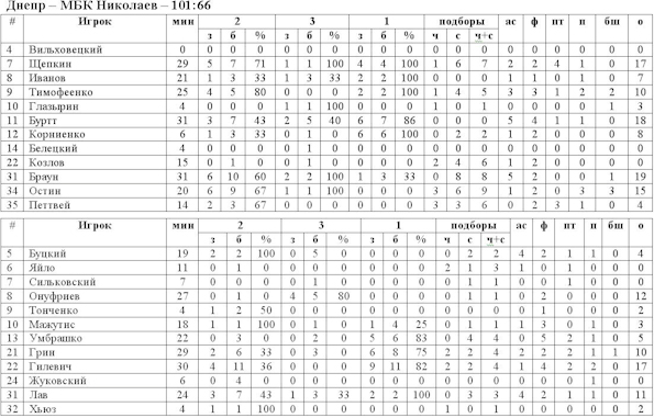 Муниципальный баскетбольный клуб из Николаева, окрылённый последними победами над «Будивельником», «Ферро» и «Азотом», сегодня прибыл в Днепропетровск, для того чтобы попытать счастье в противостоянии с местным баскетбольным коллективом. Команды начали без раскачки, демонстрируя результативный баскетбол уже с первых минут. На попадания Онуфриева, Грина и Гилевича в составе «Днепра» сумели ответить точными бросками Буртт, Браун и Щепкин, первая десятиминутка закончилась со счётом 27:20 в пользу хозяев площадки. Во втором периоде игра заметно выровнялась, начали её днепропетровцы с двух эффектных данков в исполнении Щепкина и Петтвея. У гостей наиболее активным был Брайан Грин, который своими проходами под кольцо довольно часто вынуждал оппонентов фолить на себе. Настоящим разгром николаевцев начался в третьей четверти, справедливости ради отметим, что именно в дебюте этой десятиминутки Иван Гилевич сравнял счёт, но лидер «Днепра» Буртт в нескольких атаках подряд дал старт победному спурту команды Журавлёва. С каждой минутой разница в счёте росла, а шансы гостей зацепиться за успех в этой встрече таяли. Перед заключительным игровым отрезком всё уже фактически было решено, т.к. команды начинали его при счёте 69:48. Днепропетровцы не только сохранили своё преимущество, но и существенно увеличили его. «Днепр» одержал убедительную победу со счётом 101:66.