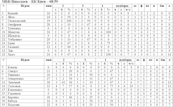 МБК Николаев довольно мощно проводит домашние игры, сегодня в гости к «корабелам» пожаловали баскетболисты БК Киев. В последнее время подопечные Валентина Берестнева радуют своих болельщиков положительными результатами, поэтому в пятницу трибуны СК «Надежда» были заполнены практически под завязку, а в таких условиях «бело-синие» играют просто неудержимо. Своё превосходство над соперником хозяева паркета бросились доказывать с первых минут. Онуфриев, Сильковский, дважды Умбрашко выстрелили дальними бросками, буквально за пять минут николаевцы сумели создать задел в десять очков. Во второй десятиминутке игра заметно выровнялась, но «судостроители» по-прежнему уверенно удерживали инициативу в своих руках. Возрождение интриги в матче произошло в дебюте третьей четверти. Подопечные Виталия Черния усилиями Липового, Тищенко и Отверченко существенно сократили отставание и имели вполне реальный шанс склонить чашу весов в свою сторону. Получили такую возможность «волки» за счёт излишней расслабленности хозяев. Максимально сконцентрированным в эти минуты выглядел Хьюз, во многом благодаря подборам центрового, а также его результативным действиям МБК Николаев и сумел удержать лидерские позиции. Встреча завершилась победой хозяев со счётом 68:59.