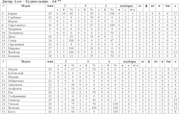Провёл сегодня свой матч и другой киевский клуб – «Будивельник». «Гладиаторы» также играли на выезде, соперником киевлян был «Днепр-Азот». В целом встреча получилась достаточной равной, исключением стали последние пятнадцать минут, но об этом позже. Морли и Анисимов уже в дебюте игрового времени сумели вывести «Будивельник» вперёд, у «Азота» отыгрывать разницу в счёте бросились Фрейзер и Карим. Соперники попеременно сменяли друг друга в роли лидера, перелом наступил в середине третьей четверти. Два дальних от Киса и Спенсера, а также точные попадания со средней дистанции Яковлева и Уилсона позволили гостям увеличить своё преимущество до 16 очков. Для того чтобы ликвидировать эту разницу подопечные Игоря Чигринова имели в распоряжении целую четверть, но с задачей возрождения интриги «трёхцветные» справиться не смогли. Команда Беррокаля пополнила свою копилку побед очередными двумя очками и продолжает занимать верхнюю строчку турнирной таблицы.