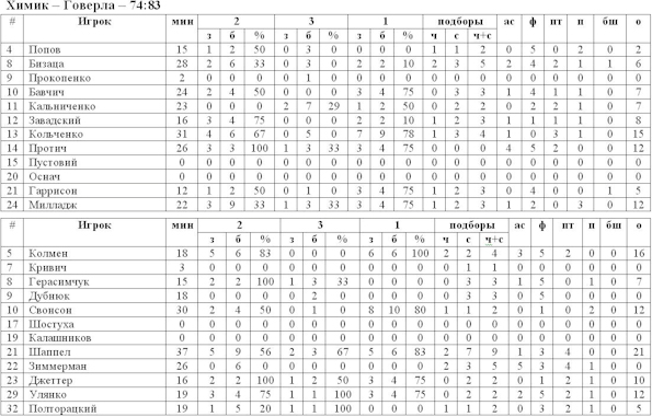 Потерпел очередное поражение в текущем чемпионате южненский «Химик», на этот раз «бело-зелёные» уступили на домашнем паркете «Говерле». Соперники начали встречу без раскачки, действуя в основном на встречных курсах. Такая игра не может не нравится болельщикам, так как в ней присутствует скорость, множество ярких моментов и набранных очков. Первая четверть завершилась со счётом 21:23. Более убедительным, преимущество ивано-франковцев стало во второй десятиминутке, когда Ульянко и Колмен просто забросали корзину «Химика». Залогом успеха подопечных Мурзина стала защита, а вернее защитная схема, которую использовали ивано-франковцы. «Медведи» «стали» зоной, а южненцам никак не удавалось разбить оборонные редуты гостей. Первая поливина закончилась со счётом 29:45, что уже свидетельствовало о тотальном превосходстве «Говерлы». В оставшееся время ликвидировать такое отставание хозяевам паркета так и не удалось, все попытки Кольченко и Протича были тщетны и «жёлто-зелёные» с лёгкостью довели встречу до победы.