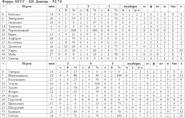 В утешительном финале встречались «Ферро-ЗНТУ» и БК Донецк. Подопечные Саши Обрадовича, во что бы то ни стало, стремились реабилитироваться перед собственными болельщиками за поражение от «Днепра» в полуфинале. Захватить инициативу в свои руки «тиграм» удалось со старта. Кравцов и Шапошников сумели организовать для своей команды рывок 0:6, но уже спустя несколько минут Овдеенко и Харис восстановили равновесие. Равная игра продолжалась вплоть до конца первой половины (вторая десятиминутка закончилась со счётом 34:34). Третья четверть началась с рывка донецкого клуба. Глебов, Цветкович и Шапошников за период сумели организовать рывок, который в итоге и решил исход поединка. Кроме этого, команде Обрадовича удавалось неплохо действовать в защите, активный прессинг не давал запорожцам реализовывать свои атаки и четверть закончилась со счётом 25:6. Такой разрыв в счёте, по сути, превращал последний игровой отрезок в формальность, т.к. отыграть 17 очков у такой команды как БК Донецк практически невозможно. «Тигры» уверенно удержали добытое преимущество и стали обладателями бронзы.