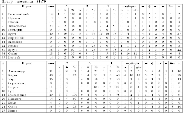Кульминацией кубковых противостояний стал матч, в котором «Днепр» играл с «Азовмашем». Встреча прошла в лучших традициях финала. Равная игра, высокие скорости, эффектные завершения атак, досрочные удаления за перебор фолов, драматическая развязка – всё это было в противостоянии мариупольцев и днепропетровцев. Начался матч с дальнего попадания Хауса, таким образом, хозяева паркета сразу же оказались в роли догоняющих. Разница в счёте не превышала пяти очков, роль лидера в команде Журавлёва на себя взял Стивен Буртт, американец не только сам действовал очень результативно, но и отдавал точные передачи на партнёров по команде. Марио Остин за три секунды до конца четверти точно исполнил два штрафных и сравнял счёт. Вторая десятиминутка позволила «Днепру» впервые в этой встрече выйти вперёд, на паркете по-прежнему велась упорная борьба, множество фолов и жёсткие противостояний лишний раз подчёркивали это. Сумел разбросаться в этом периоде и лидер «машиностроителей» – Карри, в то время как у днепропетровцев от атаки к атаке прибавлял Браун. На большой перерыв команды ушли при счёте 44:40 в пользу хозяев, самое интересное болельщиков ожидало уже во второй половине. Рамелл Карри в третьей четверти продолжал терзать оборону соперников своими разящими проходами, не раз защитнику удавалось забивать «два с фолом» и это принесло свои плоды. «Машиностроители» смогли ликвидировать разницу в счёте и вернуть себе лидерские позиции. Оставшееся время превратилось в настоящую гонку за титулом МVP: Буртт и Карри превосходили по результативности абсолютно всех игроков, безусловно, каждый из них думал в эти минуты не о заветном звании самого ценного игрока, а о победе своей команды в финале, но всё же эта дуэль бомбардиров была крайне интересной. Напряжение на паркете сохранялось вплоть до самой финальной сирены. Ключевым стал эпизод за минуту до конца матча, когда Буртт в центре поля сумел выполнить перехват и в отрыве набрать два очка, тем самым, сравняв счёт (79:79). Уже в следующей атаке Карри попытался осуществить очередной проход, но мяч после его броска предательски попал в дужку кольца и снова оказался у днепропетровцев. Фол Александера на всё том же Буртте вынудил Диметриуса закончить встречу досрочно, а лидер «бело-синих» реализовал один из двух и вывел свою команду вперёд. Следующая атака «Азовмаша» получилась точным отображением предыдущей. Снова неудачный проход Карри, снова фол на игроке «Днепра» (на этот раз это был Остин) и снова один из двух точно выполненных штрафных (81:79). «Азовские львы» имели возможность вырвать победу, но дальний бросок Хауса не достиг цели и первый трофей этого сезона отправился в руки команде Журавлёва.